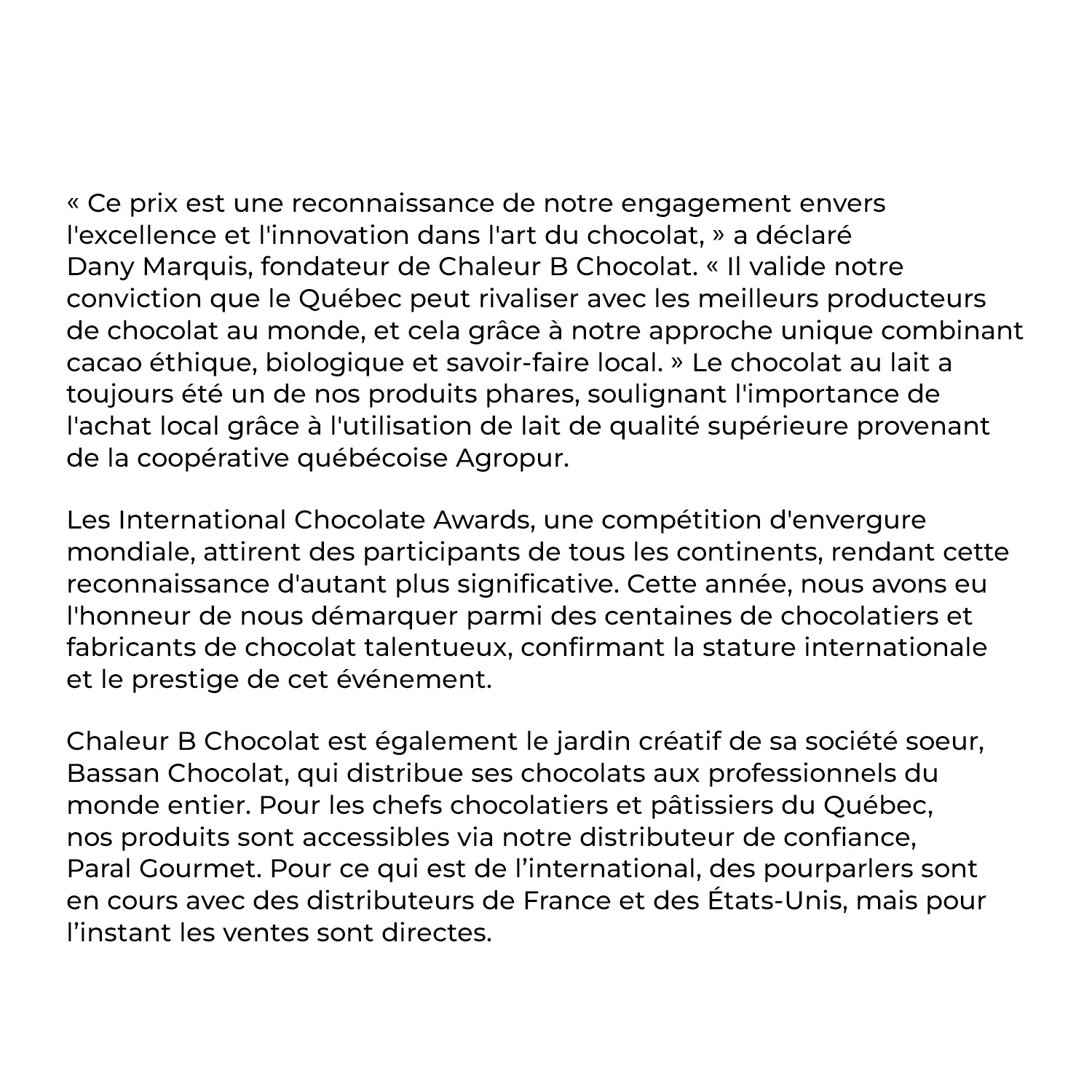 Ce chocolat représente un retour au source pour nous, un retour à l’enfance avec ces chocolats sur base de lait écrémé traditionnel.